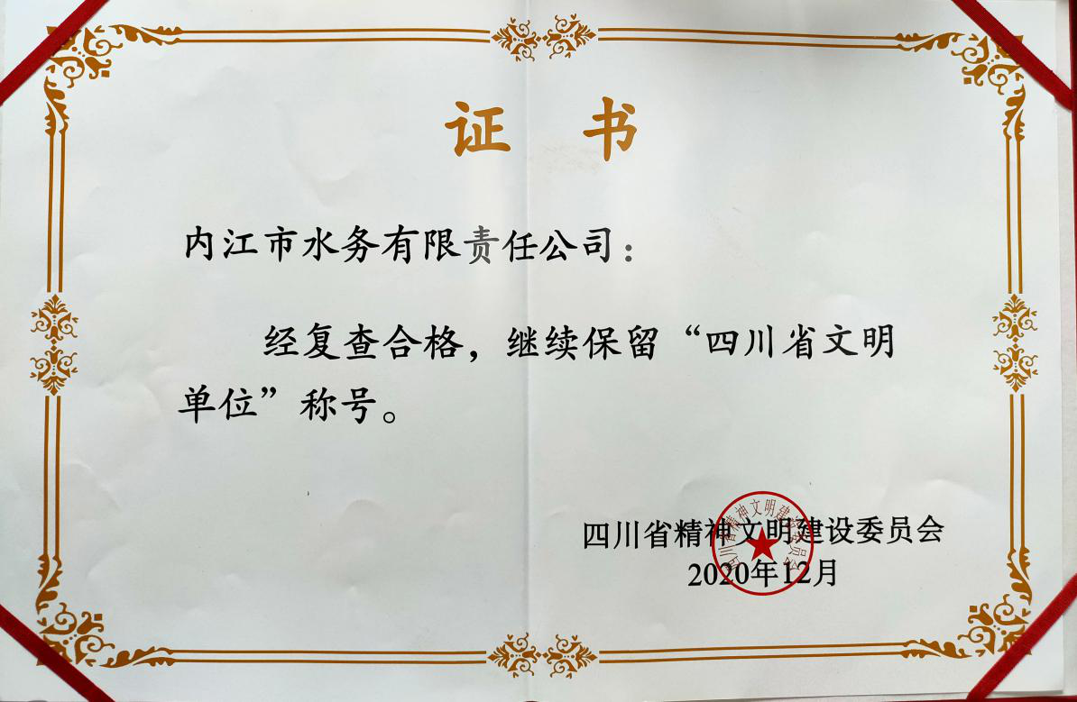 近年來,市水務(wù)公司黨委始終以*新時代中國特色社會主義思想為指導(dǎo),推進精神文明建設(shè)工作不松勁,抓好生產(chǎn)經(jīng)營工作促發(fā)展,推動公司精神文明和物質(zhì)文明建設(shè)的雙豐收。根據(jù)四川省精神文明建設(shè)委員會《關(guān)于復(fù)查確認繼續(xù)保留稱號的四川省文明城市、文明村鎮(zhèn)、文明單位、文明家庭、文明校園的通報》(川文明委〔2020〕20號),內(nèi)江市水務(wù)有限責(zé)任公司順利通過復(fù)查,繼續(xù)保留“四川省文明單位”榮譽稱號。