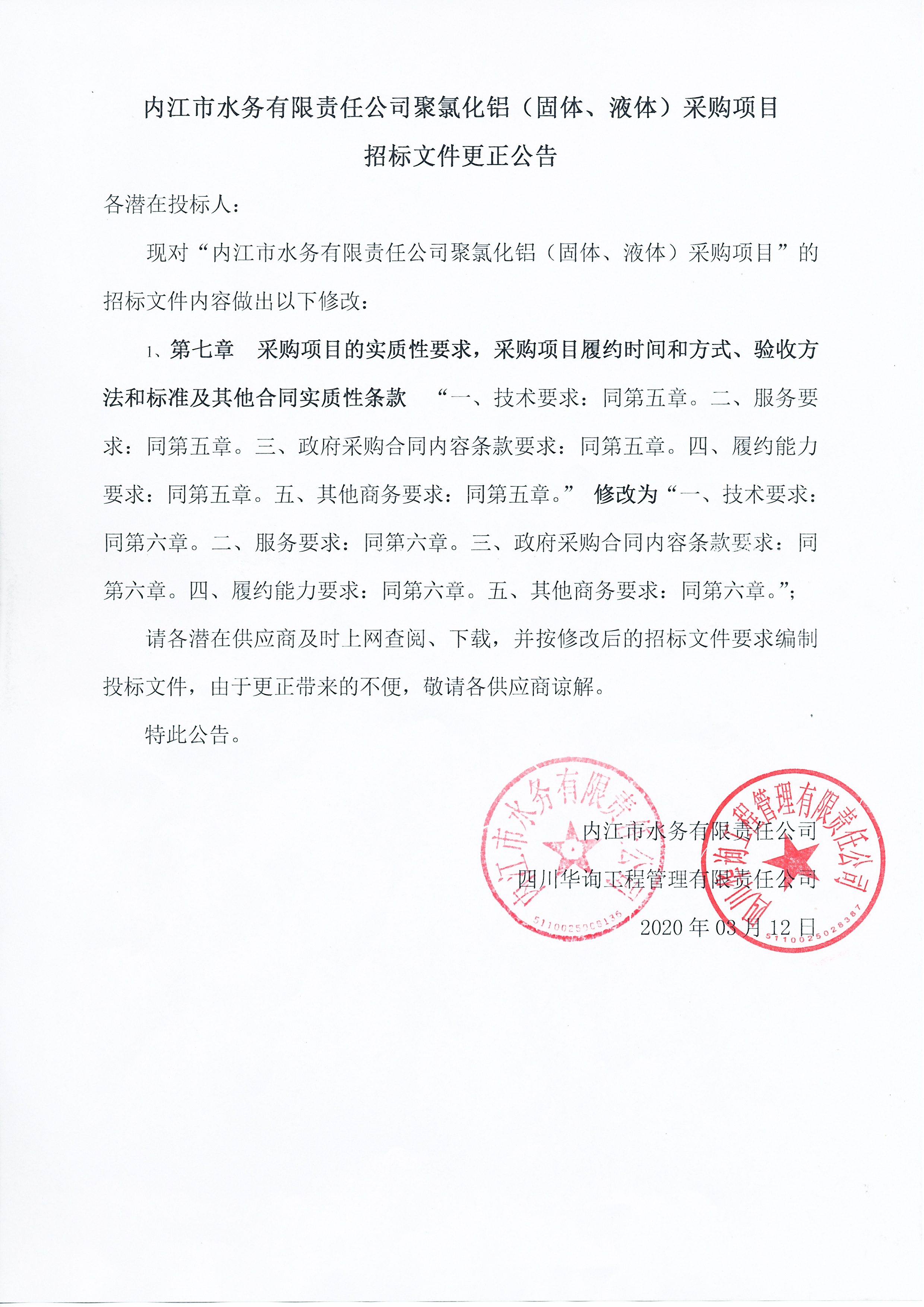 內(nèi)江市水務(wù)有限責(zé)任公司聚氯化鋁(固體、液體)采購(gòu)項(xiàng)目招標(biāo)文件更正公告