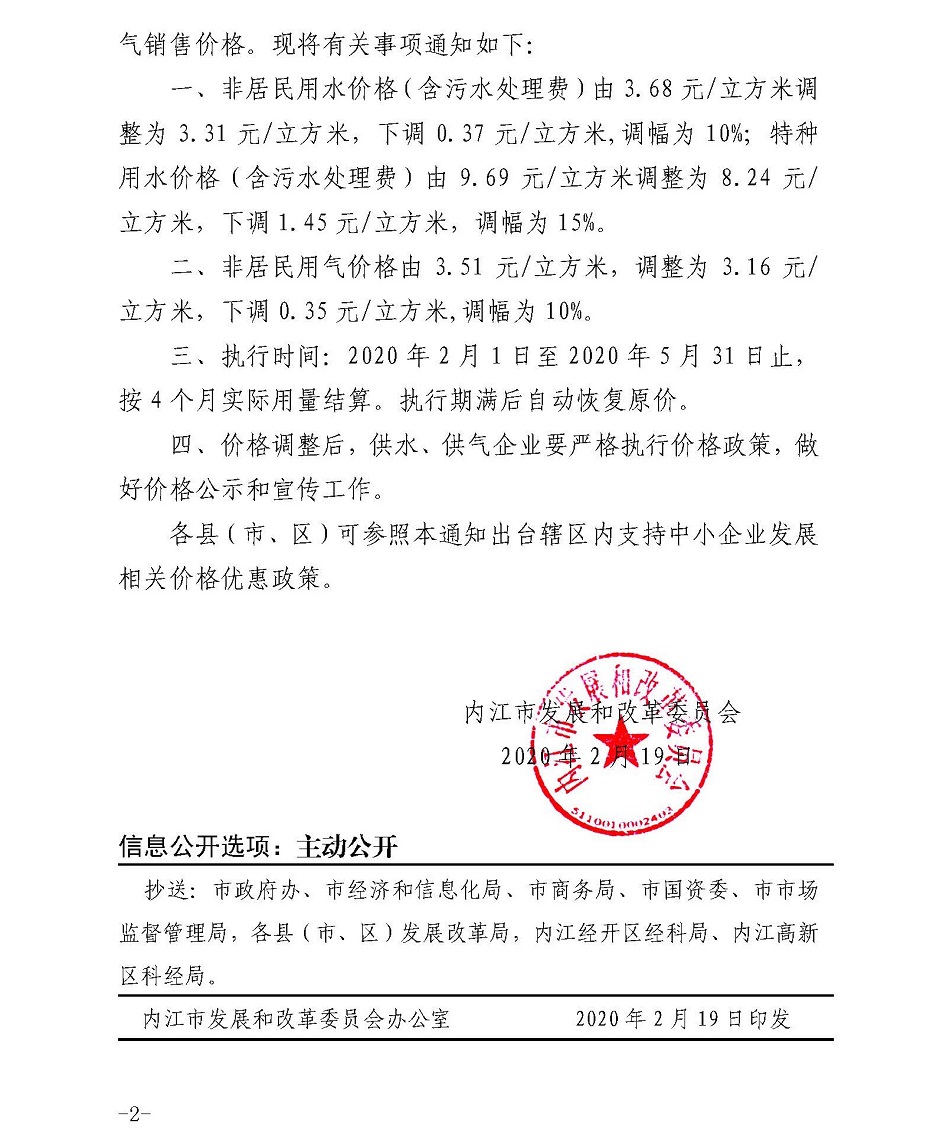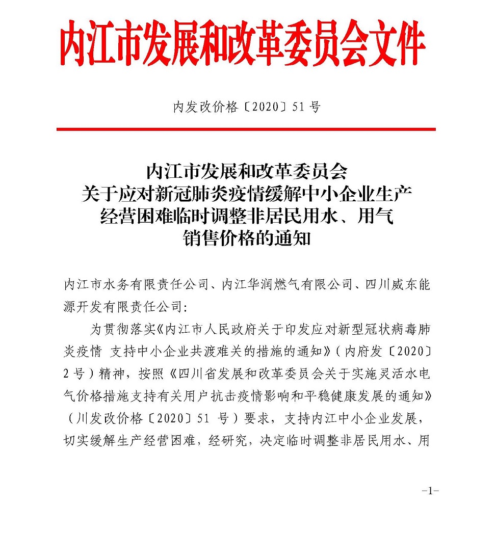 內(nèi)江市發(fā)展和改革委員會關(guān)于應(yīng)對新冠肺炎疫情緩解中小企業(yè)生產(chǎn)經(jīng)營困難臨時調(diào)整非居民用水、用氣銷售價格的通知