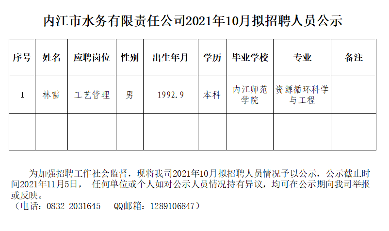 內(nèi)江市水務(wù)有限責(zé)任公司2021年10月擬招聘人員公示