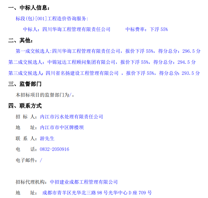 內(nèi)江市第二污水處理廠二期工程造價咨詢服務項目中標結(jié)果公示