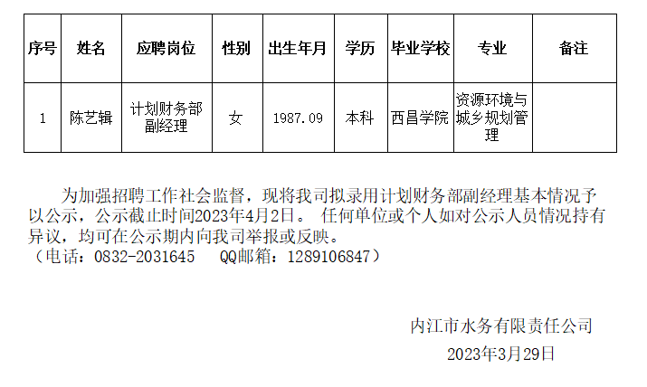 內(nèi)江市水務(wù)有限責(zé)任公司擬錄用計劃財務(wù)部副經(jīng)理公示