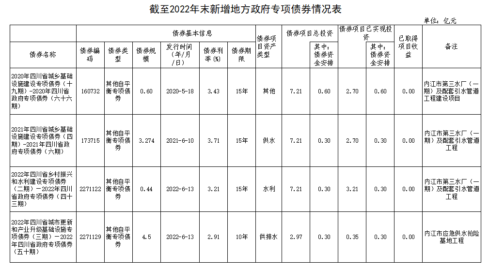 內(nèi)江市本級(jí)截至2022年末新增地方政府債券存續(xù)期信息公開(水務(wù))