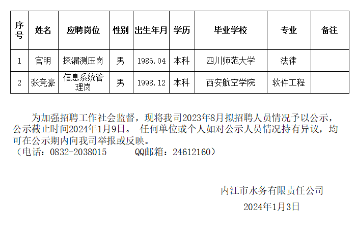 內(nèi)江市水務(wù)有限責(zé)任公司2024年1月擬招聘人員公示
